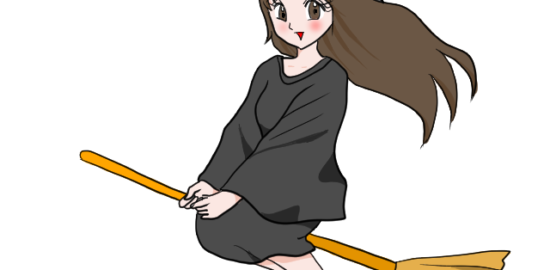 箒に乗って飛ぶ魔女っ子のイラストです。…