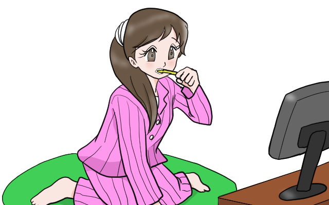 テレビを見ながら歯を磨く女の子のイラスト