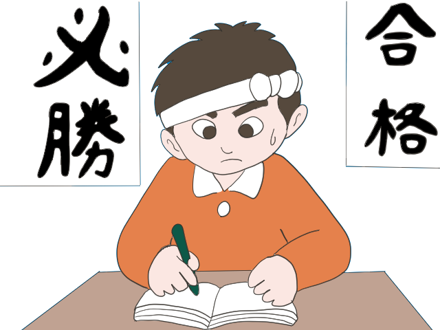 鉢巻をまいて勉強をする男の子のイラストです。