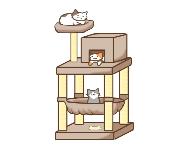 猫が登ったり、遊んだりすることで、ストレスや運動不足を解消することができるキャットタワーのイラストです。
