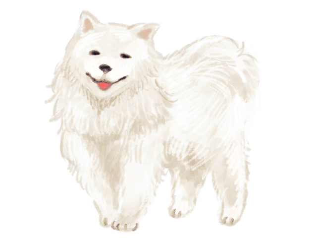 真っ白でもふもふな毛並みと、『サモエドスマイル』と呼ばれる穏やかな口元が特徴的な犬、サモエドのイラストです。