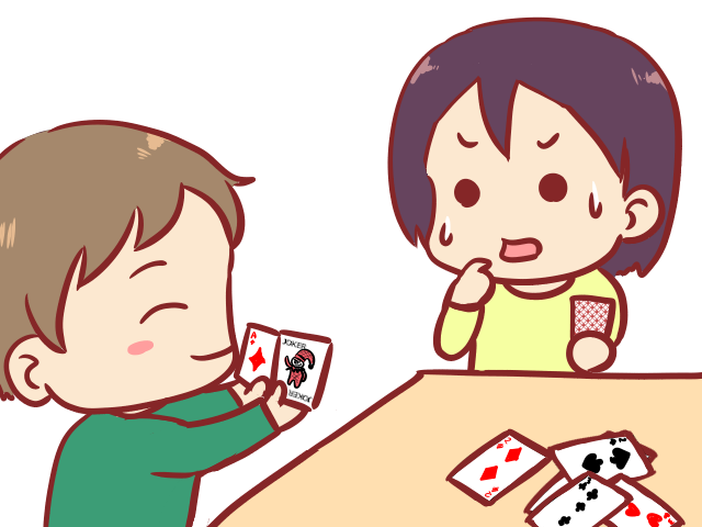トランプ(ババ抜き)をして楽しむ人たちのイラストです。
