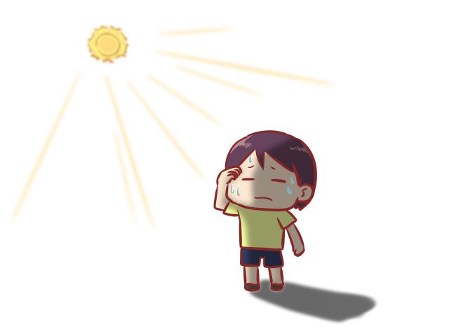 太陽が強く照りつける中で汗をかく人のイラストです。