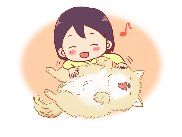 犬を撫でて癒されている人のイラストです。