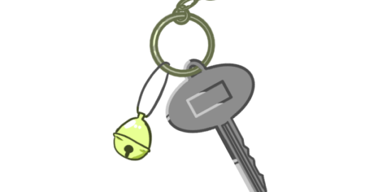 キーホルダーに付けられた鍵と鈴のイラストです。…