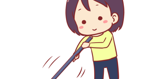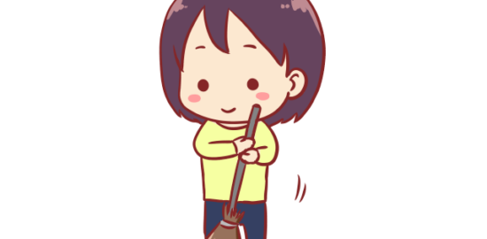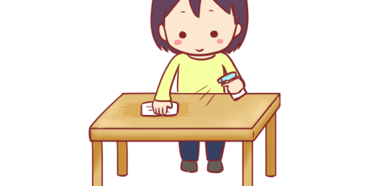 テーブルを拭いて綺麗にしている人のイラストです。…