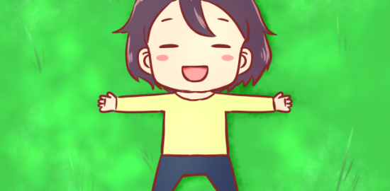 草原で気持ちよさそうに寝転ぶ人のイラストです。…