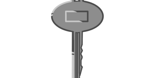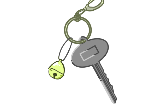 キーホルダーに付けられた鍵と鈴のイラストです。…