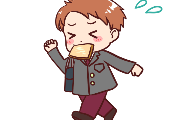 パンをくわえながら、学校へ急ぐ男子学生のイラストです。…