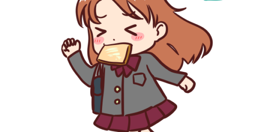 パンをくわえながら、学校へ急ぐ女子学生のイラストです。…