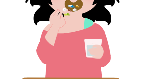 薬をたくさん飲む女性のイラストです。…