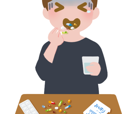 薬をたくさん飲む男性のイラストです。…